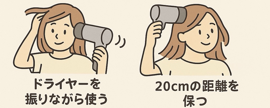 ドライヤーを髪に近づけすぎると、熱が集中してダメージの原因になります。目安としては、20cm程度離して使用しましょう。また、同じ部分に長時間当て続けないことも大切です。