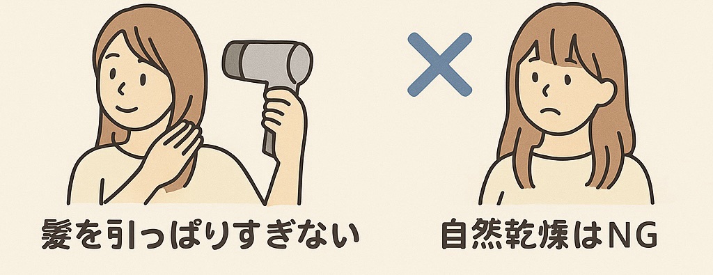 ブラシや手ぐしを使って乾かす際、無理に引っ張ると髪が切れたり、毛根に負担がかかってしまいます。特に濡れた状態の髪はとても繊細で傷みやすいため、優しく整えるように意識しましょう。絡まりがある場合は、乾かす前に目の粗いコームでやさしくとかすとよいでしょう。