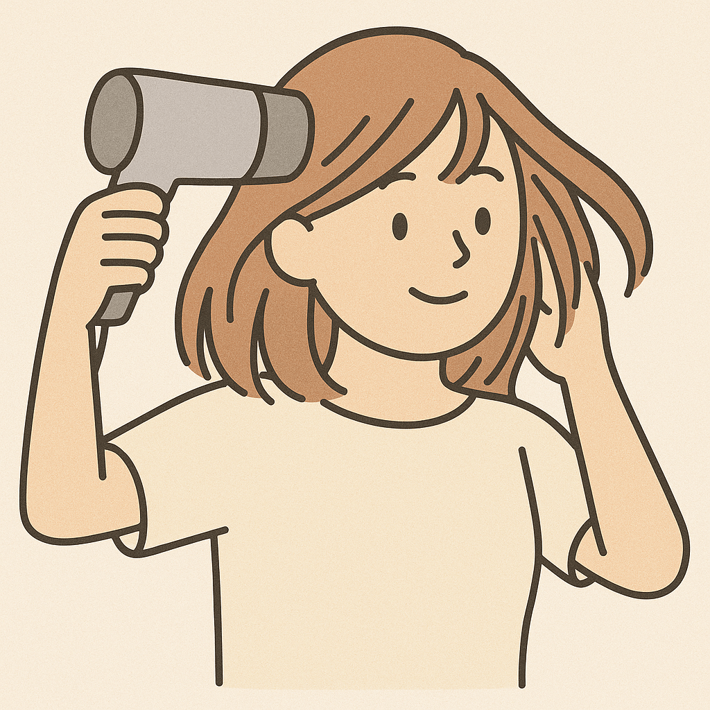 ドライヤーを一点に当て続けると、そこだけが過剰に乾いてしまい、ダメージやオーバードライの原因になります。ドライヤーを左右に振りながら、風を分散させるように乾かすと、髪に均一に熱が届き、自然でまとまりのある仕上がりになります。また、風の温度も適度に分散されるため、熱による負担も減ります。